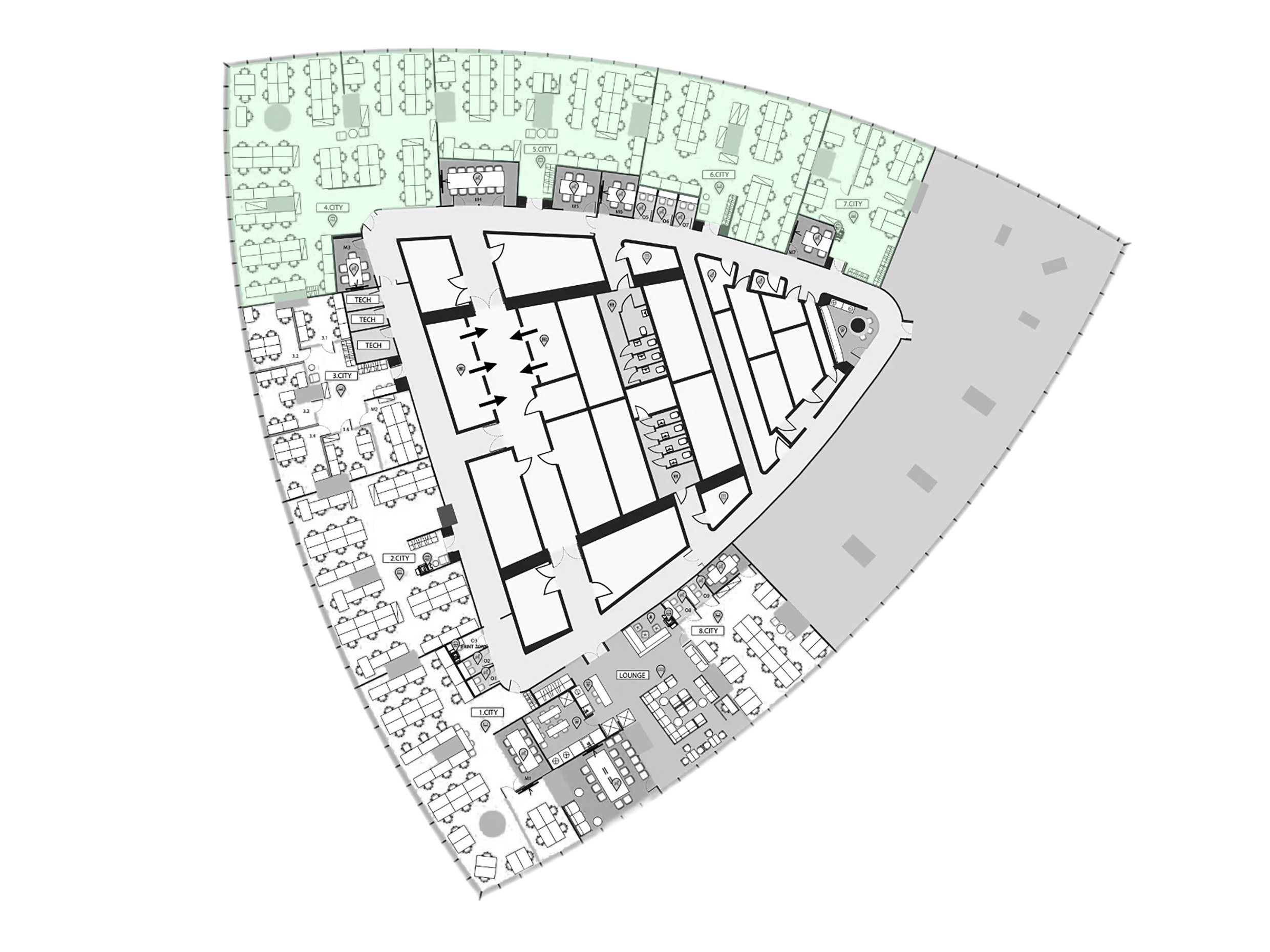 «Башня Федерация» — это одна из самых высоких построек Европы, насчитывающая 95 этажей. Высота потолков составляет 3,5 метра, что создает ощущение пространства и свободы. Форматы офисов включают как open space, так и кабинетные планировки, что позволяет гибко подойти к организации рабочих зон.